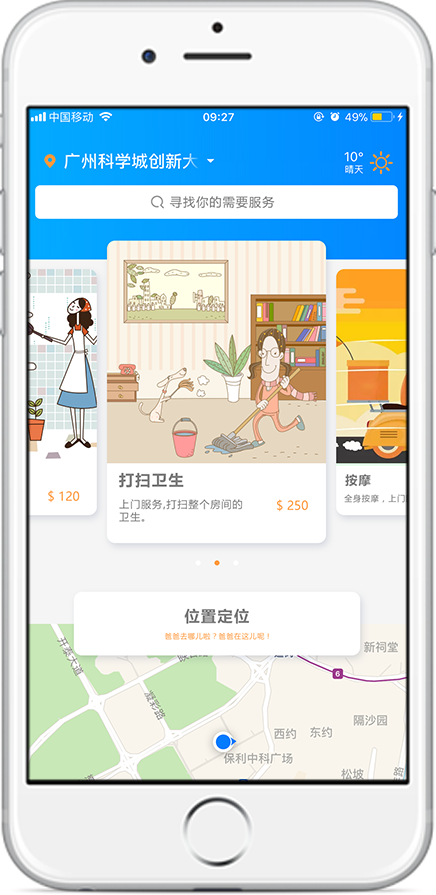 家属通过客户App可以随时查看老人的定位与基本健康状况,还能为老人购买服务、跟踪订单、服务评价等。
