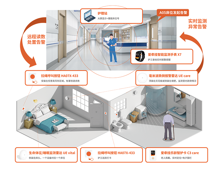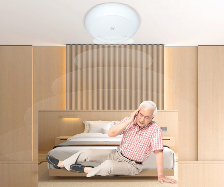 在每个床位或浴室的天花板安装爱牵挂毫米波雷达跌倒报警器UE care——采用60GHz毫米波雷达技术,实现即时声光&远程告警、区域滞留过长告警、智能无感监测,可快速识别室内跌倒事故发生。